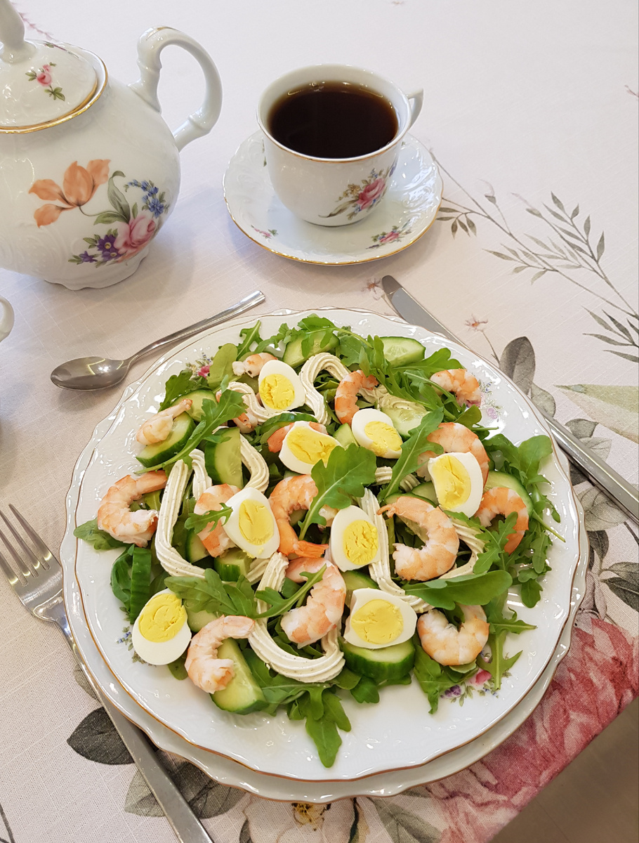 Для сервировки на тарелках первым слоем укладывают рукколу, на которую накладывают выдавленный творожный сыр. Огурцы нарезают кольцами и располагают вокруг этого «жар-птицы». Завершающим штрихом становятся креветки и разрезанные пополам перепелиные яйца, которые придают салату завершенность и красоту.