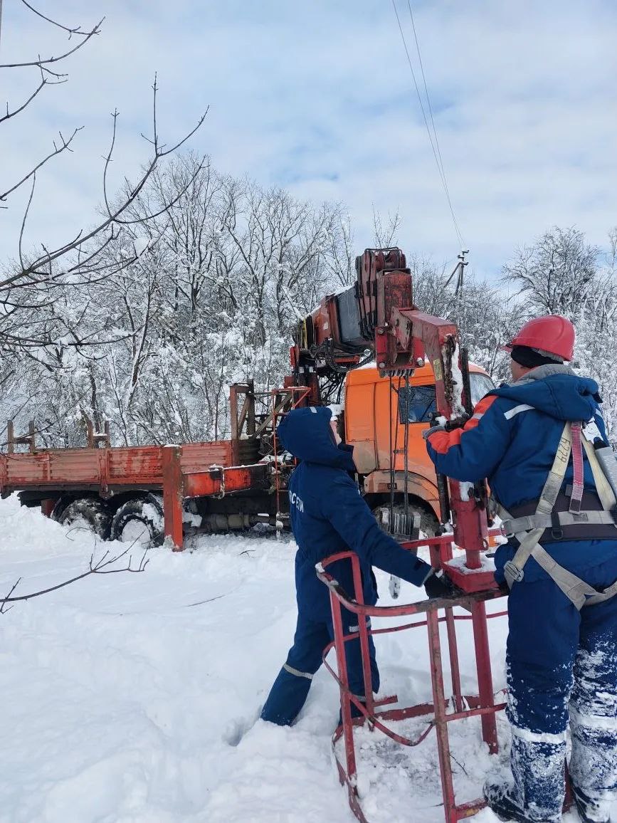 На фото – бригада Калининского РЭС Тимашевских электрических сетей под руководством главного инженера РЭС Александра Крюкова оказывает помощь в восстановлении электроснабжения в х. Грозный Майкопского района.