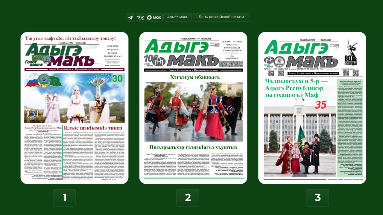 На фото представлены разные выпуски газеты «Адыгэ макъ». Два из них — реальные, а одного выпуска не существует в реальности.