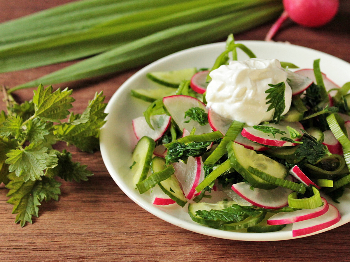 Пробуйте новый легкий салат из дачных овощей и крапивы, дополняйте его по своему вкусу, и делитесь своими впечатлениями!