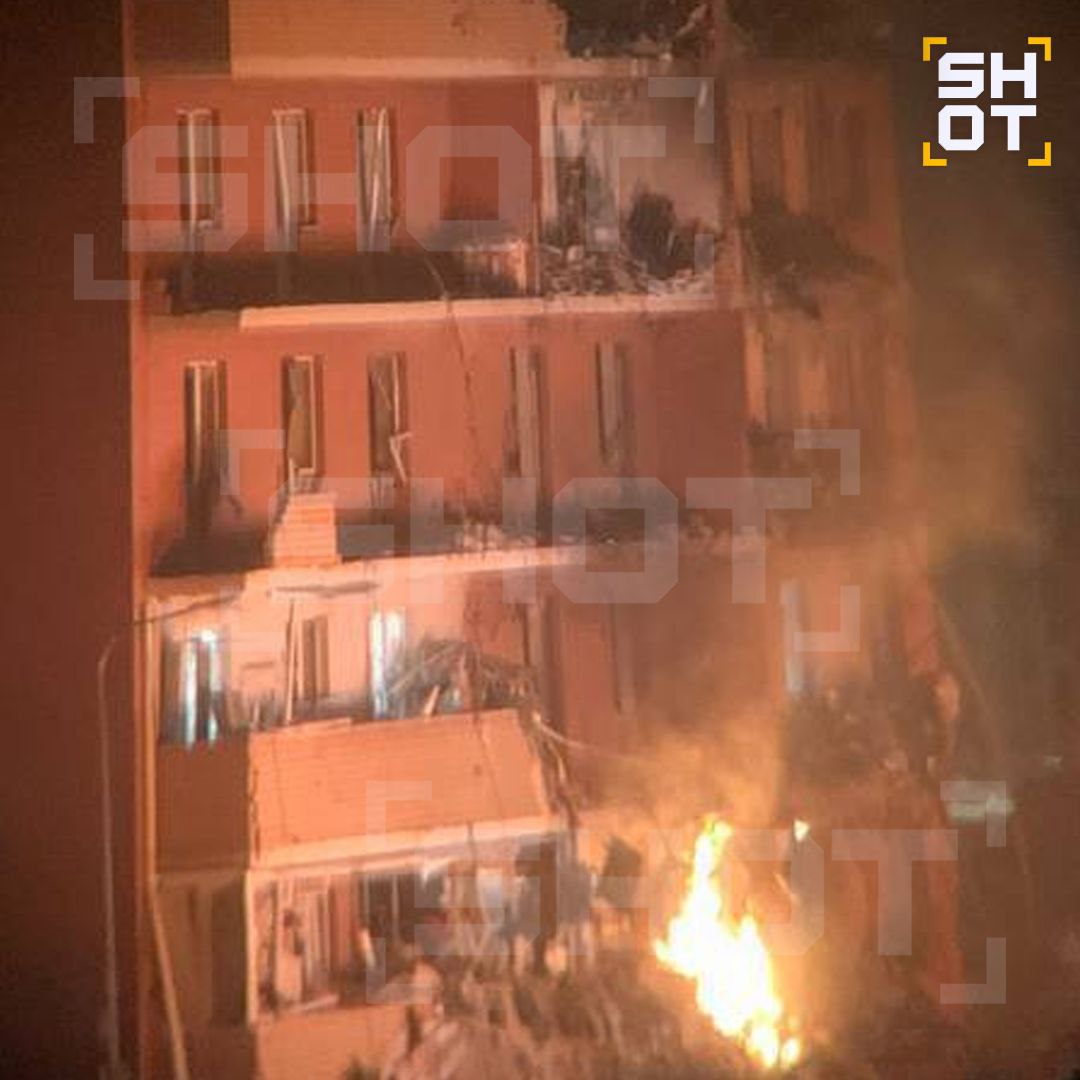 Как рассказали SHOT местные жители, у здания сильно посечн фасад здания и разбиты десятки окон на нескольких этажах, также загорелись машины на парковке рядом с домом.