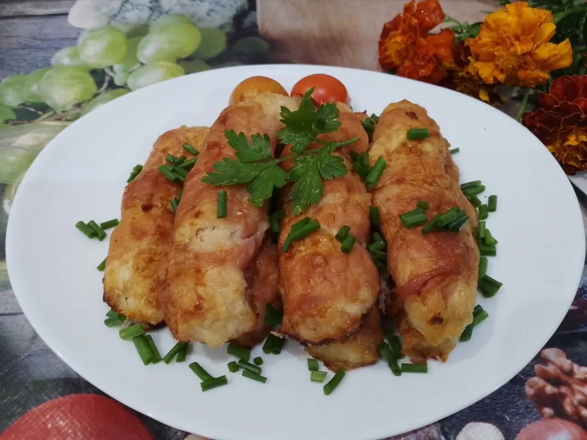 Аппетитные рулетики, завёрнутые в хрустящий бекон, станут настоящим украшением любого стола. Нежный куриный фарш, приправленный ароматными специями, создает неповторимый вкус, который не оставит равнодушными ни вас, ни ваших близких. Это блюдо готовится легко и быстро, а фарш можно использовать любой по вашему усмотрению.