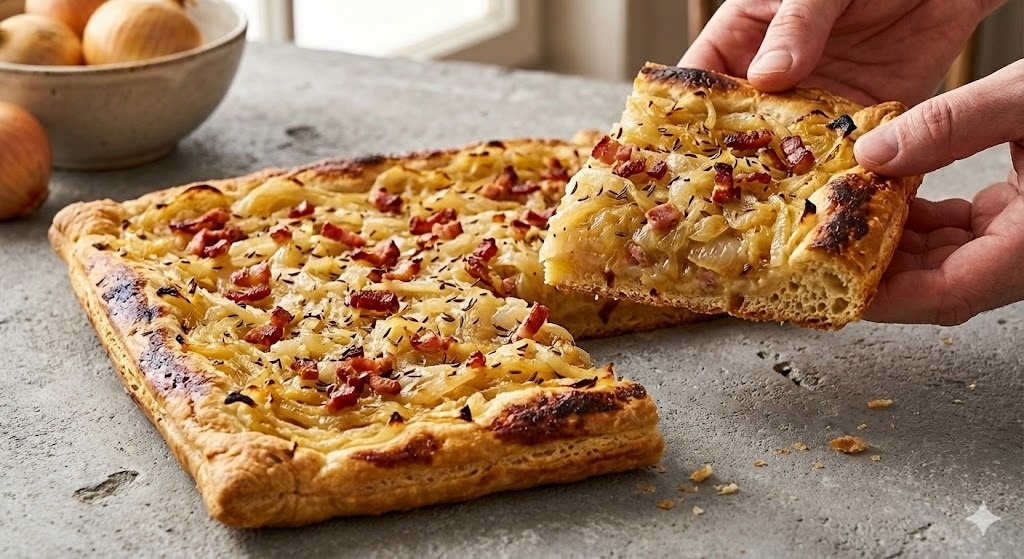 Лук в этом блюде превращается в сладковатую начинку, а добавление бекона и тмина придает невероятный аромат. Важно помнить: не стоит заедать его в одиночку!