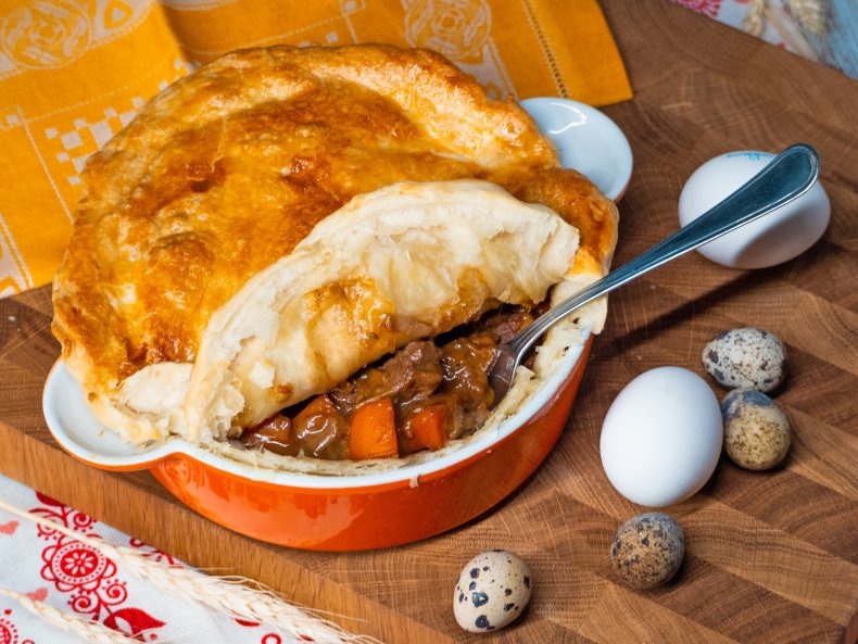 Начинка — мягкое рагу из говядины с луком-пореем, морковью и специями. Пиво добавляет глубину и нежность, говяжий бульон закрепляет насыщенность. Все тушится до мягкости, после чего соединяется с тестом.