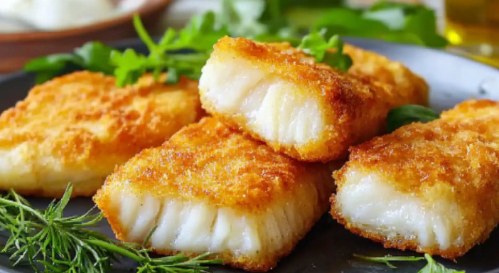 Чтобы корочка была максимально хрустящей, можно обвалять кусочки в муке перед окунанием в кляр, а затем дополнительно обвалять в панировке.
