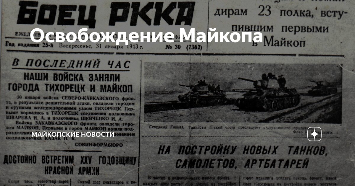 В этот день в 1943 году в результате стремительного наступления 9-й горнострелковой дивизии и действий партизанских отрядов Майкоп был возвращен Красной Армии.