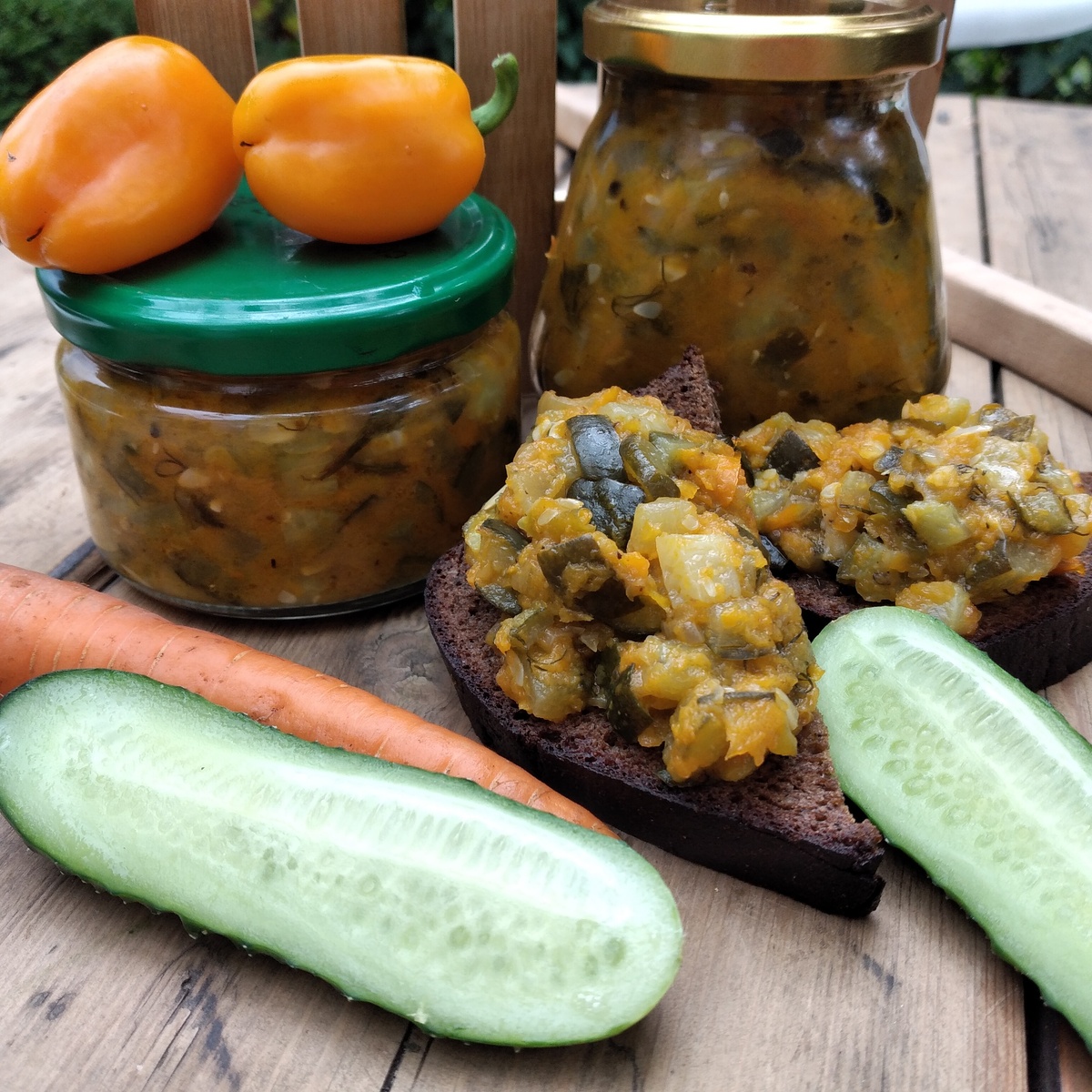 Для консервации на зиму добавьте в готовую закуску 3 ст. ложки 9% уксуса, доведите до кипения и разложите по стерилизованным банкам. Накрывать не нужно.