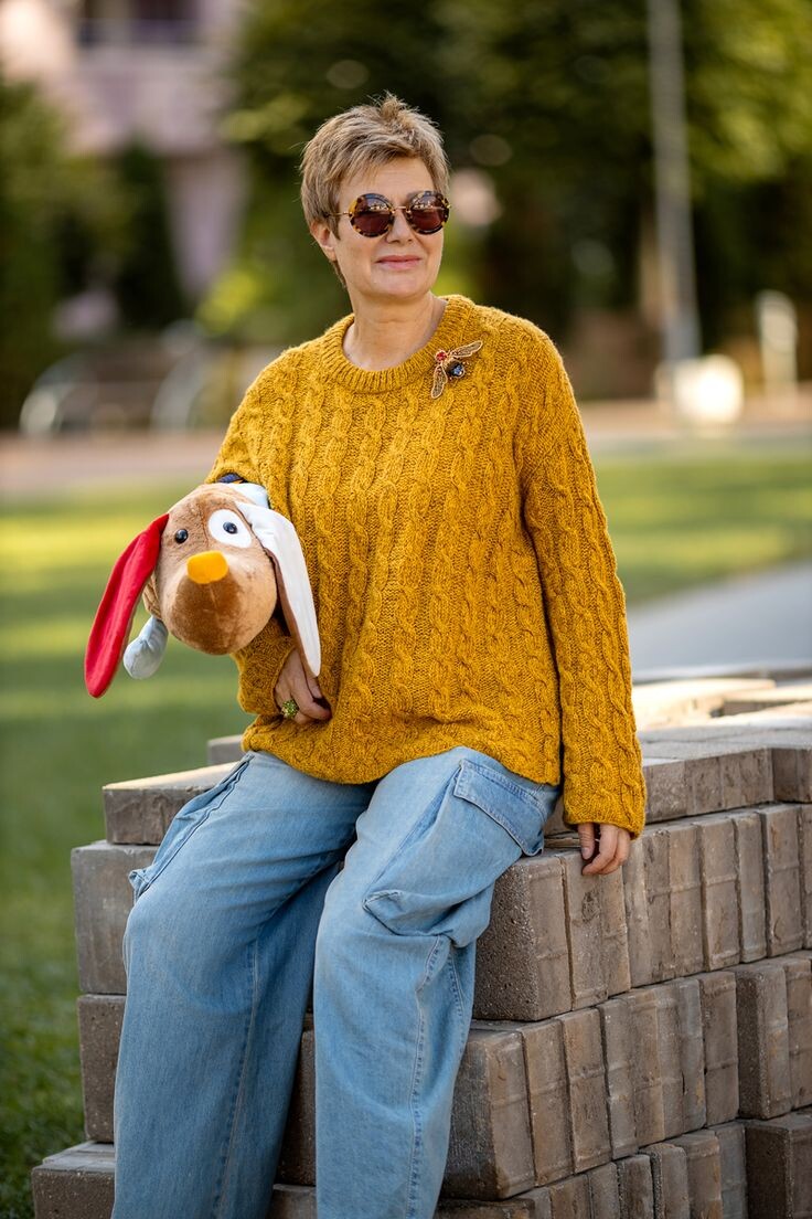1. Джемпер горчичного цвета: Элегантный свободный джемпер с фактурной вязкой будет отличным дополнением к повседневному гардеробу. Этот лаконичный, но стильный предмет идеально сочетается с светло-голубыми джинсами, добавляя изящества любому образу.