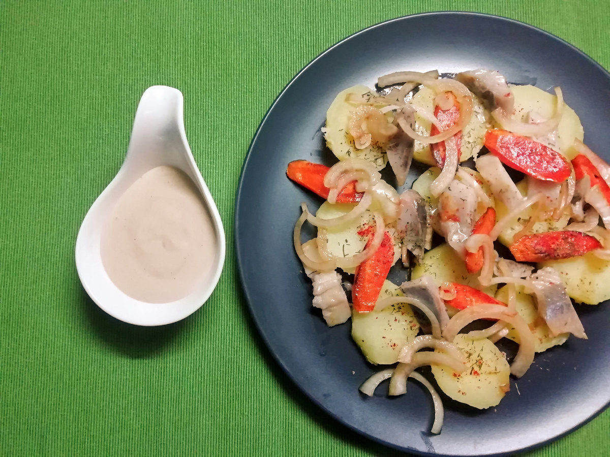 Чтобы салат получился особенно приятным, обычно используют молодые клубни и жирную селёдку. Иногда в блюдо попадает морковь — но композиция от этого не утяжеляется. Чаще всего всё собирается прямо в глубокой миске или подаётся порционно — немного картофеля, немного селёдки, чуть маринованного лука, ложка гладкого соуса рядом.