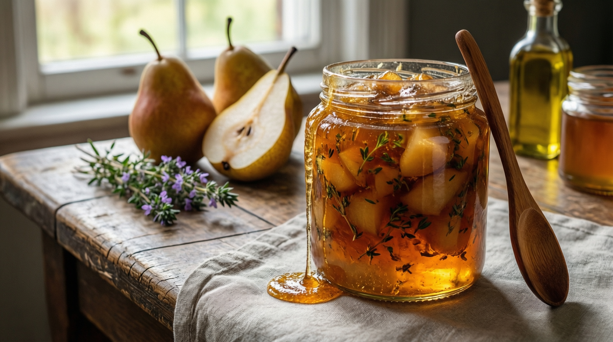 Груша — фрукт с утончённым вкусом, часто описываемым как «пьянящий» и медовый, но иногда он может показаться плоским. Именно здесь на помощь приходит тимьян, который придаёт варенью удивительную глубину и сложность.