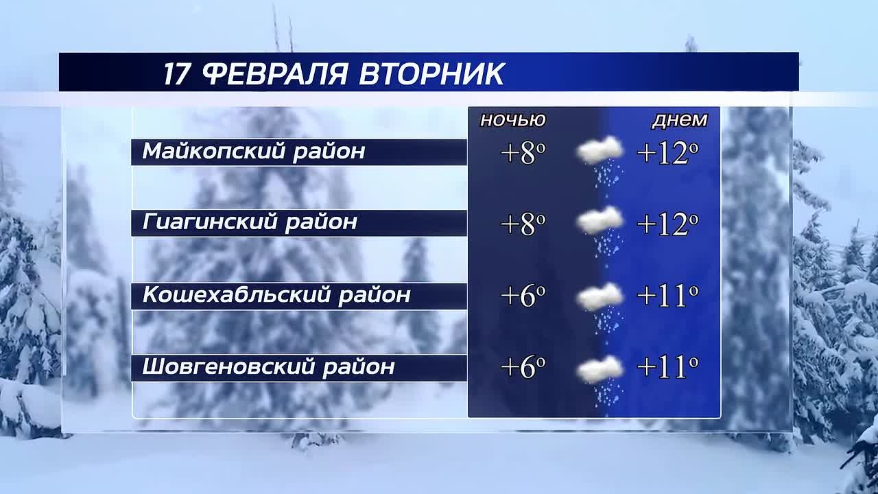 Доброе утро!17 февраля в Адыгее ожидается дождь.Ветер: до 7 м/с.Майкоп | Мыекъуапэ +13Адыгейск | Адыгэкъалэ +14Гиагинский район | Джэджэ район +13Кошехабльский район | Кощхьэблэ район +12Шовгеновский район | Шэуджэн район...