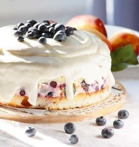 7. Осторожно вмешивают ягоды в смесь, пытаясь сохранить их целостность. Затем в форму закладывается первый корж, сверху распределяется начинка и накрывается вторым коржом. Убираем конструкцию в холодильник, чтобы торт застыл — это займет пару часов.