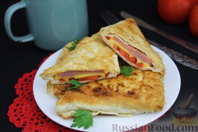 - Ленивые пирожки: Треугольники из лаваша с ветчиной, помидорами и сыром, обжаренные в яйце, станут хитромодным блюдом на ваших завтраках.