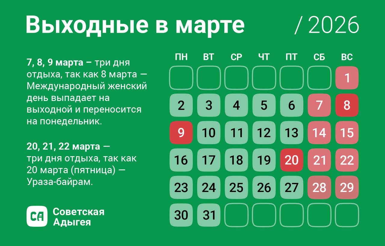 20, 21, 22 марта — снова три дня отдыха подряд, так как 20 марта — праздник Ураза-байрам.
