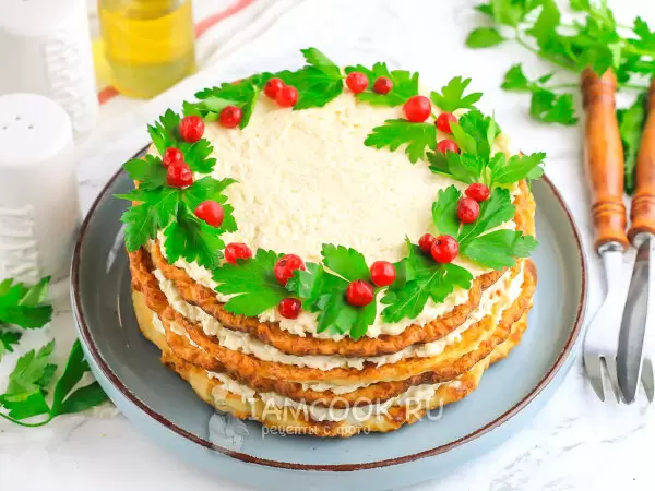 Шаг 3: Для начинки подмороженные плавленые сырки натирают на терке, добавляют немного соли, майонез и, по желанию, измельчённый чеснок. Всё тщательно перемешивают. Сборка торта включает в себя намазывание каждой лепёшки сырной начинкой. Чтобы украсить готовое блюдо, подойдут свежая петрушка и ягоды брусники.