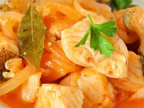 Филе судака необходимо разморозить, нарезать на небольшие кубики размером примерно 2х2 см. Это ускорит процесс приготовления и поможет рыбе быстрее пропитаться соусом. Лук следует нарезать полукольцами. Затем на сковороде разогреть растительное масло и обжарить лук до золотистого цвета, прибавив смесь перцев и лавровый лист. После этого добавить томатный соус и 150 мл воды, тщательно перемешать и тушить в течение трех минут, чтобы соусы загустели.