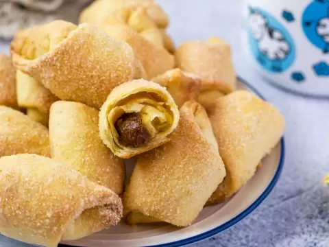После остывания каждую часть теста раскатывают в круг толщиной 2–4 мм и нарезают на 8 треугольников. На широкий край каждого треугольника помещают половину чайной ложки варёной сгущёнки и аккуратно заворачивают в рогалики, прижимая уголки.