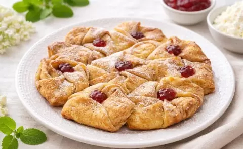 Блинчики с творожной начинкой — это не только вкусно, но и красиво, если подойти к подаче с креативом. Вместо стандартных конвертиков можно использовать интересный способ сворачивания, который превращает блины в аппетитные цветочки. После запекания они слегка подрумяниваются, остаются мягкими и выглядят как настоящий шикарный десерт без лишнего декора.