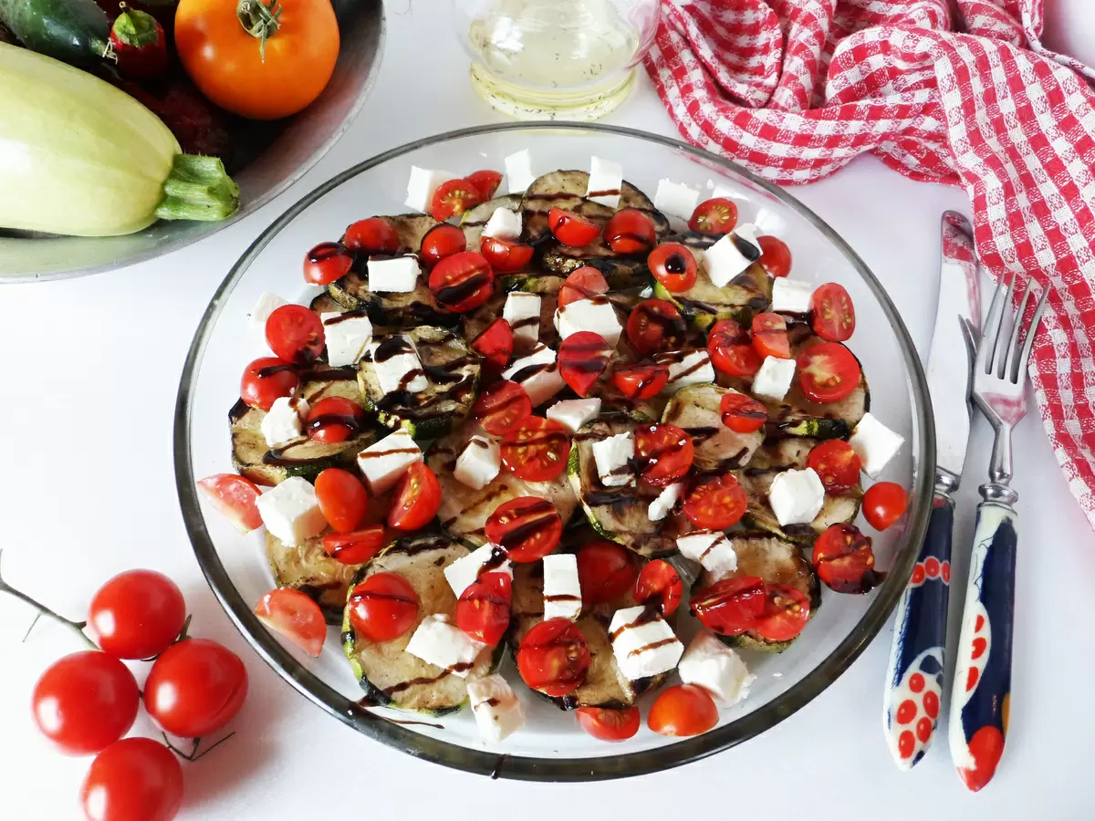 На плоском блюде выложите обжаренные кабачки, а сверху добавьте кусочки свежей феты и разрезанные пополам помидоры черри. Для завершения блюда добавьте немного черного молотого перца, бальзамического соуса и растительного масла. Такой простейший в приготовлении, но невероятно вкусный салат станет настоящей изюминкой любого летнего стола!