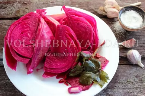 Свеклу нарезают тонкими кружочками, чеснок делят на половинки, а острый перец измельчают. В глубокой кастрюле овощи выкладываются слоями: на дно кладется свекла, затем капуста, чеснок и перец, сверху идут листья сельдерея. Заключительным слоем снова должна быть свекла, затем все заливается остывшим рассолом и накрывается. Кастрюлю оставляют на три дня при комнатной температуре, а затем перемещают в холод на пять дней.