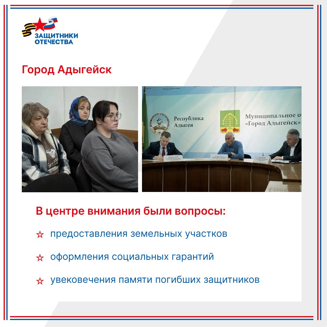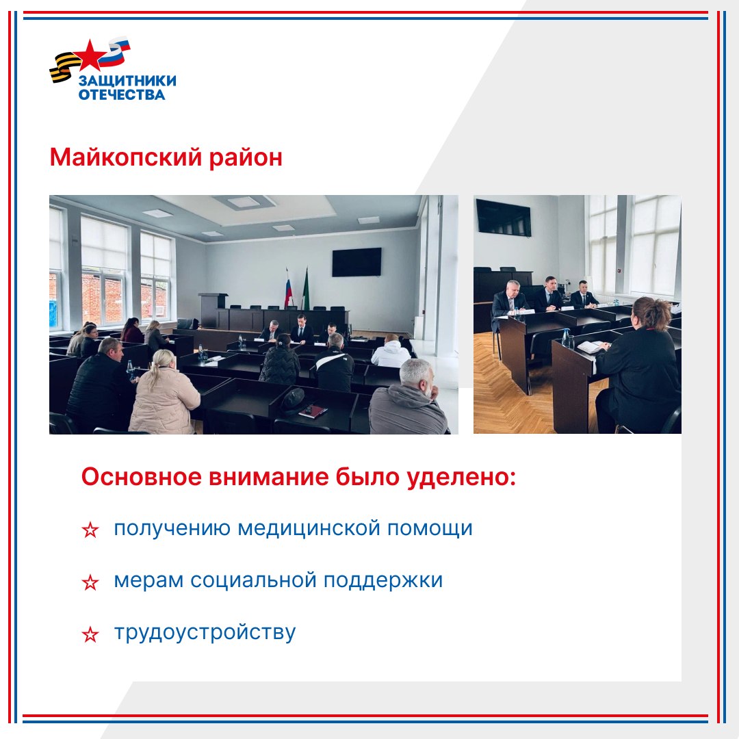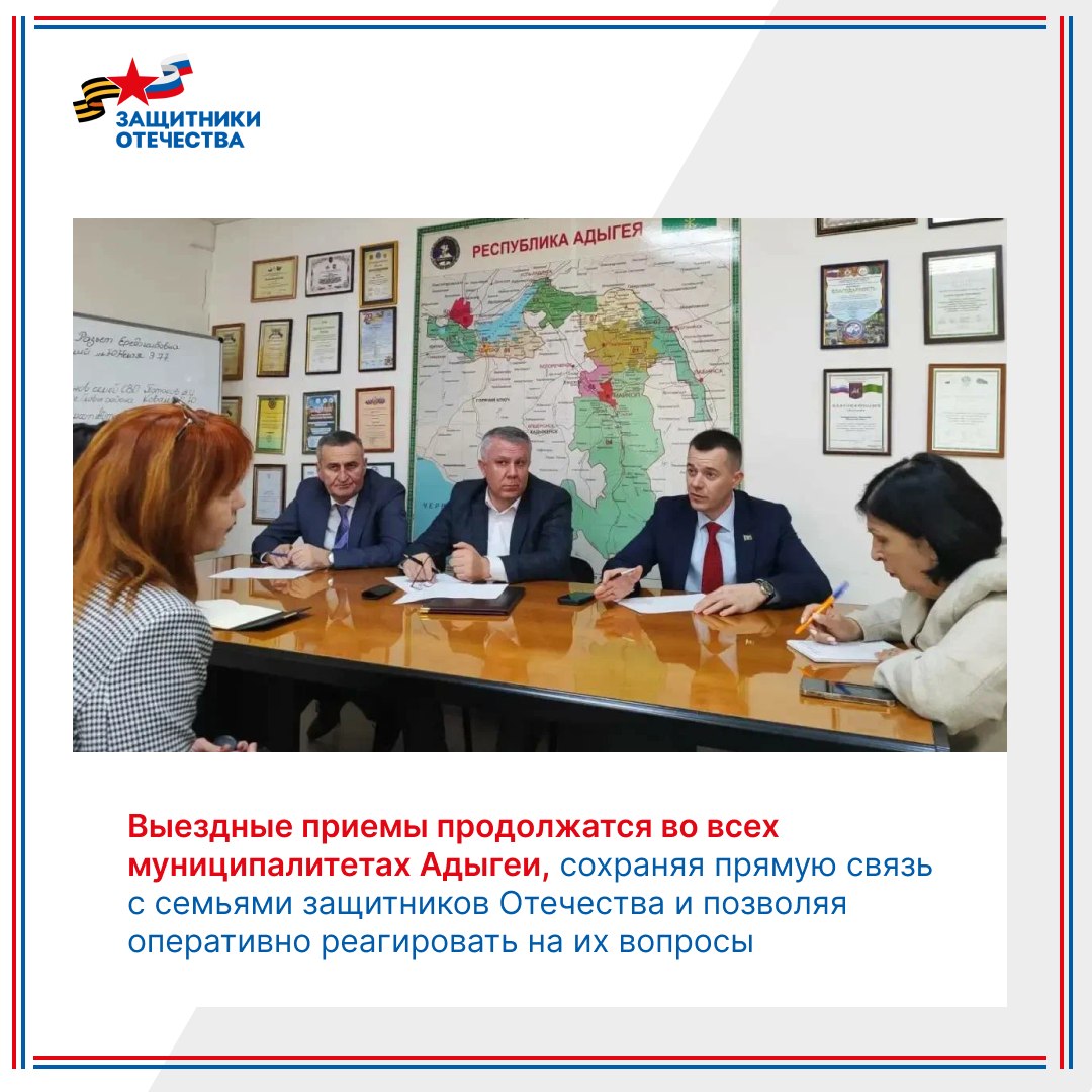 В Майкопском и Теучежском районах, а также в городе Адыгейске состоялись выездные приемы, направленные на поддержку ветеранов СВО и членов их семей.