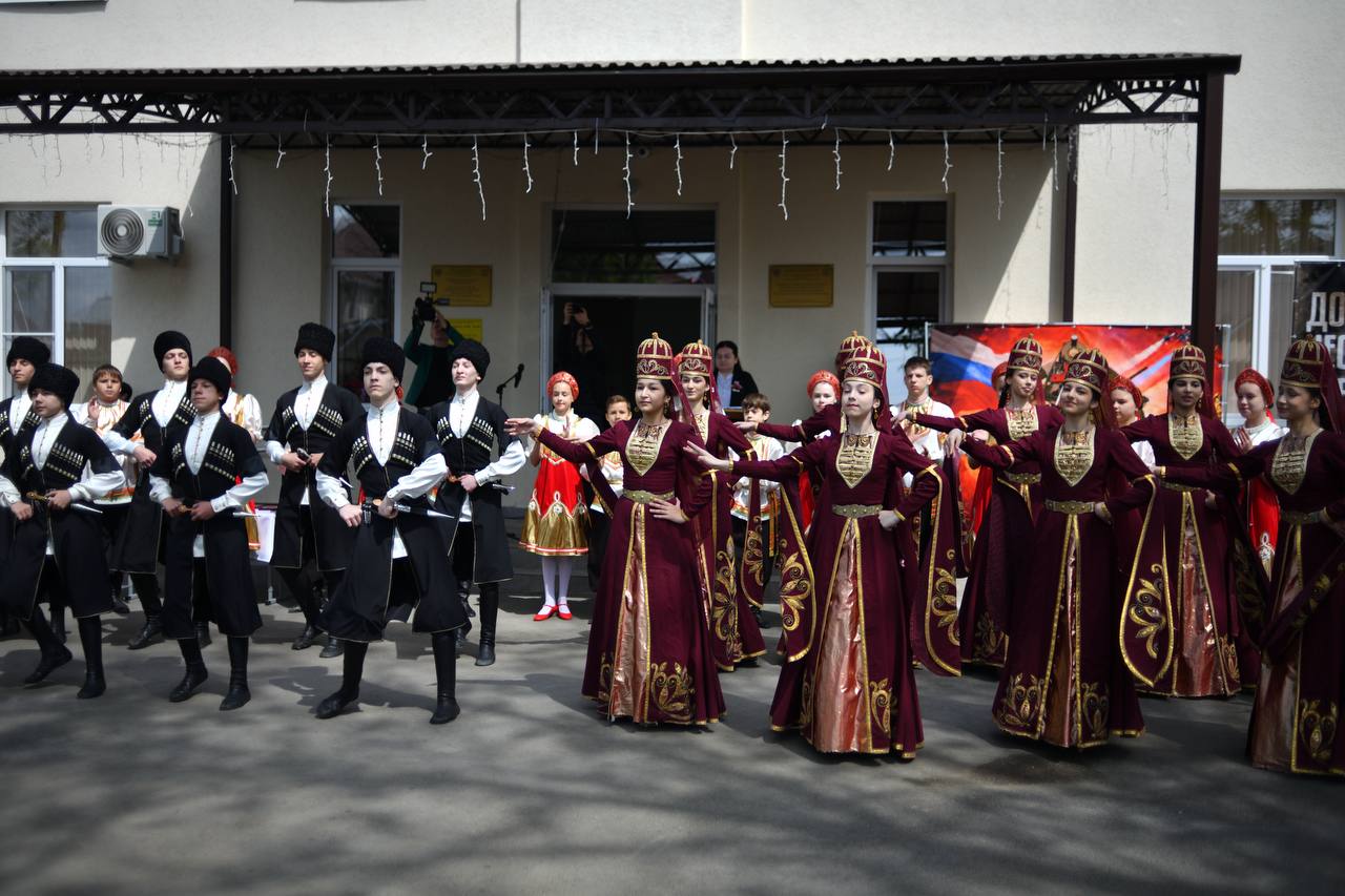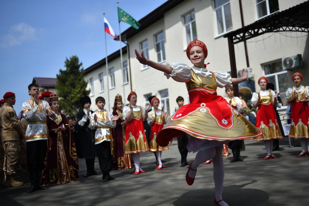 На линейке гостей встречали военный оркестр, танцевальные коллективы «Иван-да-Марья» и «Зори Майкопа», юнармейцы и ученики.